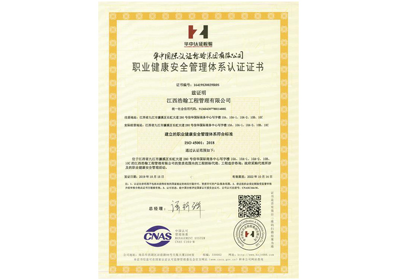 置业健康安全管理体系认证证书